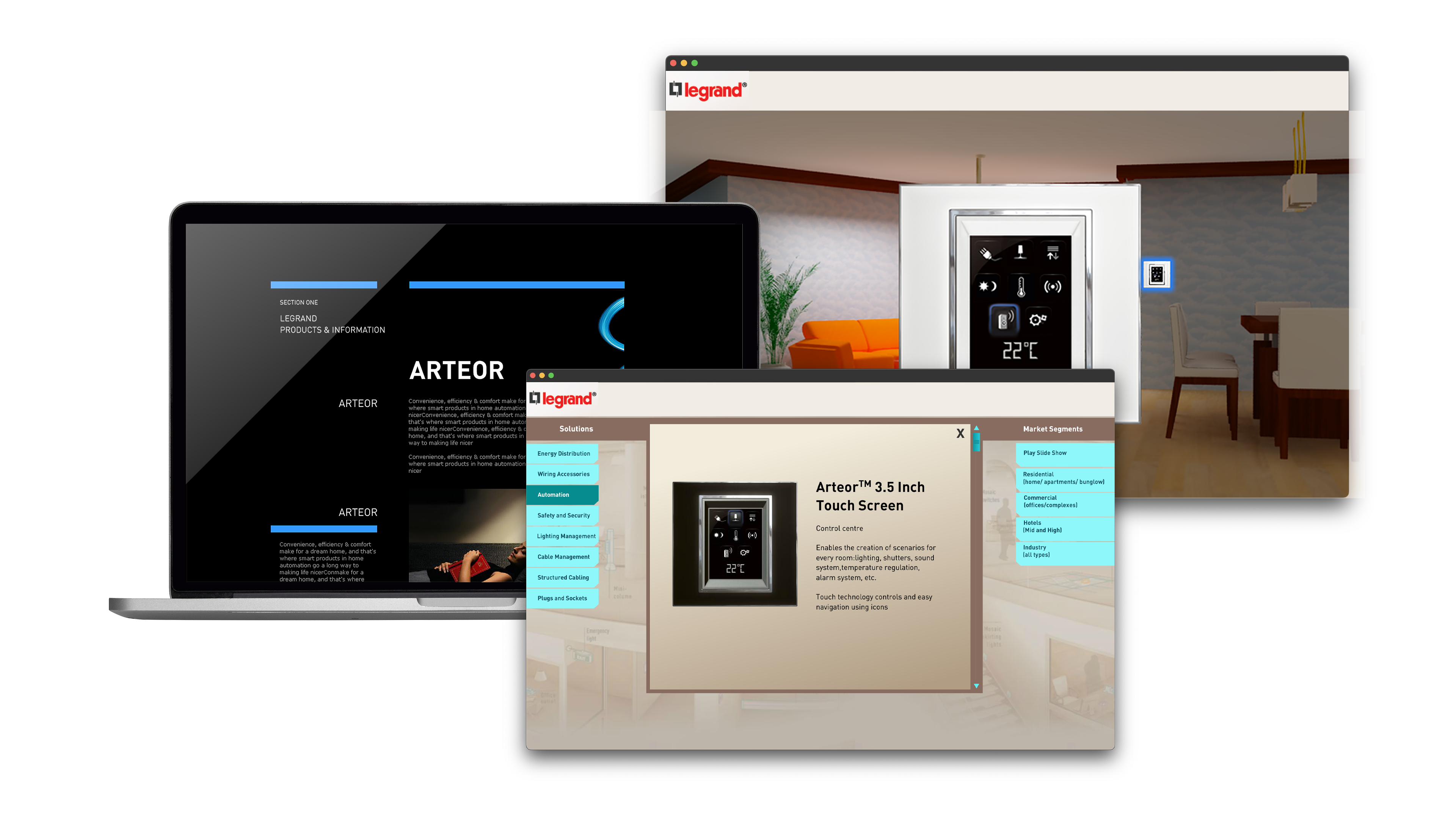 I designed a presentation kiosk that provided an immersive experience for users to explore Legrand's smart product range. The kiosk featured an intuitive touch interface that allowed users to